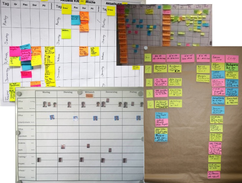 - und natürlich gibt es IT-Tools beliebiger Art, der 2-Weeks-Planer ist herrlich einfach, alle sehen das gleiche, sowohl das, was heute angesagt ist als auch für die nächste Woche