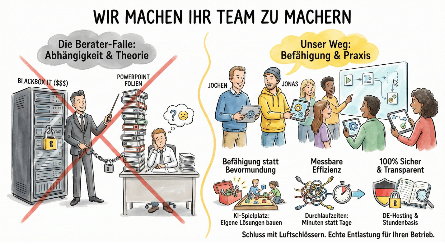 Wir verkaufen keine vorgefertigten KI-Agenten und wir stülpen Unternehmen keine fertigen Konzepte über. Unsere Philosophie ist Hilfe zur Selbsthilfe. Wir befähigen Ihre Mitarbeiter, mit den richtigen Tools ihre Prozesse selbstständig zu digitalisieren und Veränderungen bei voller Effizienz in hochkomplexen Datenwelten eigenständig umzusetzen. Datensicherheit ist uns dabei absolut heilig. Wir schaffen Klarheit darüber, was Unternehmen beachten müssen, und bauen das Wissen in Ihrer Firma auf – mit dem Ziel, dass Sie uns als Berater am Ende gar nicht mehr brauchen.